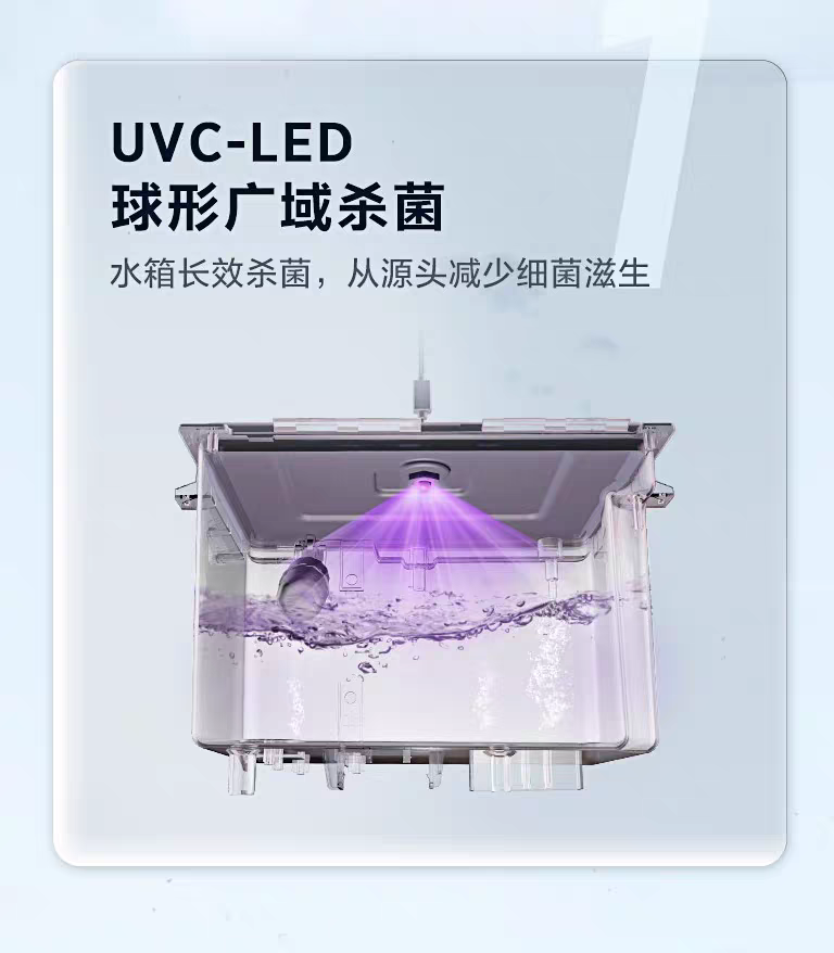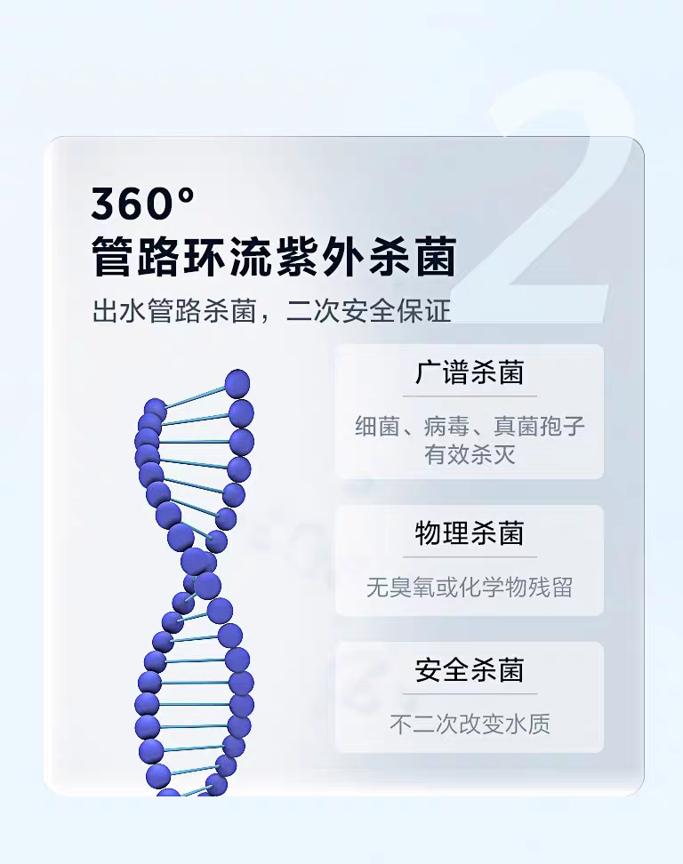 双模杀菌:净水箱360°全方位UVC-LED杀菌,实用新型专利,提高杀菌效果;温水、冷水出水再经全物理UV杀菌,出水水质更安心;