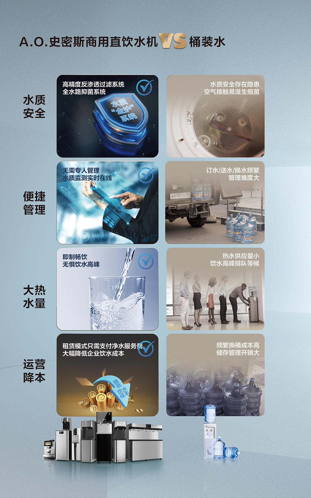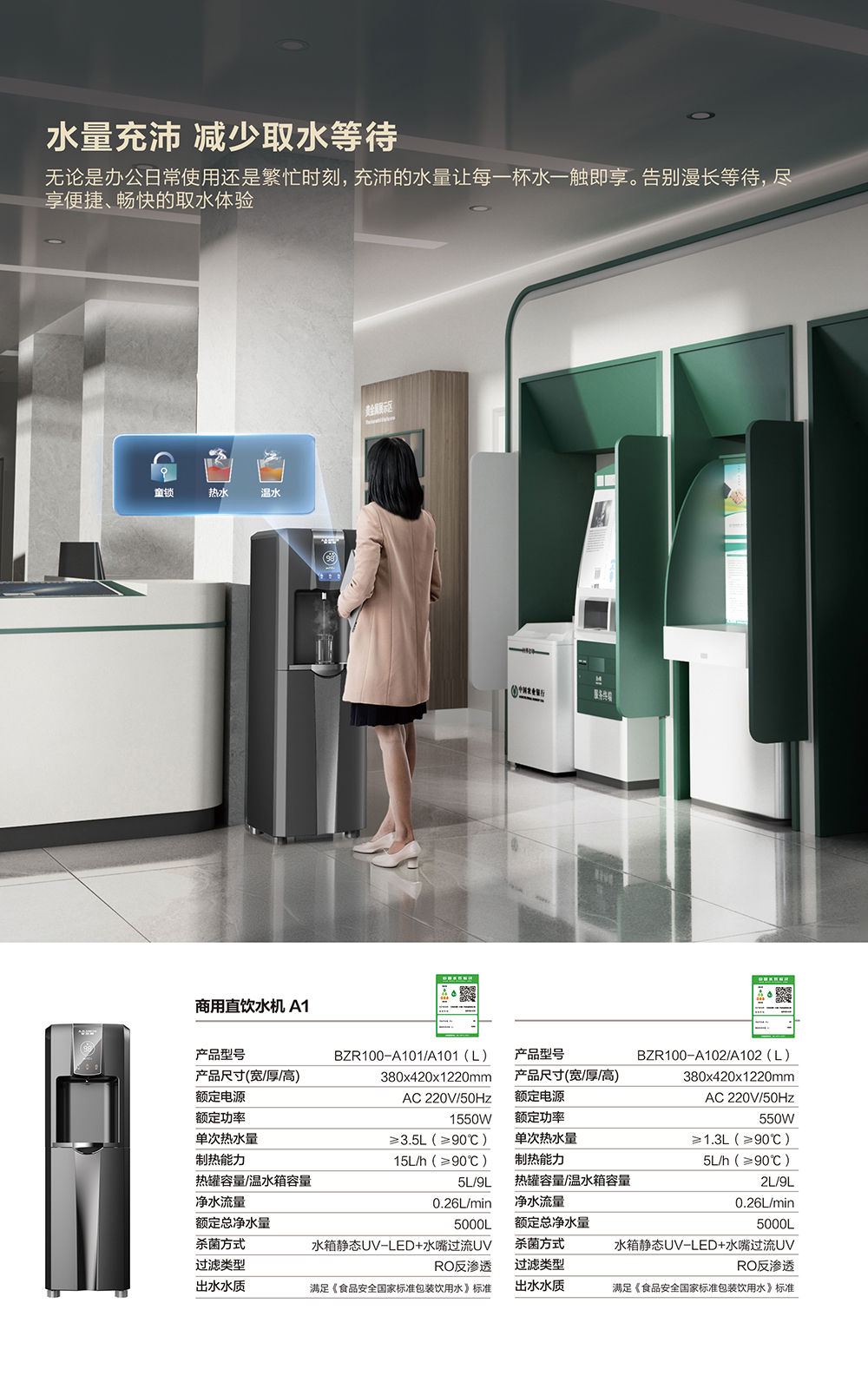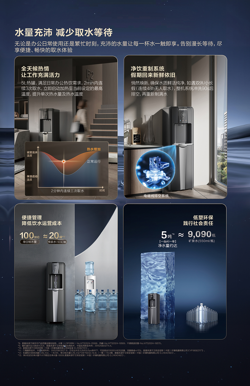 智能热水增容:5L热罐,满足日常办公热饮需 求,2min内连续三次取水,立即启动加热至当前 设定的最高温度,提升单次热水量及热水温度;