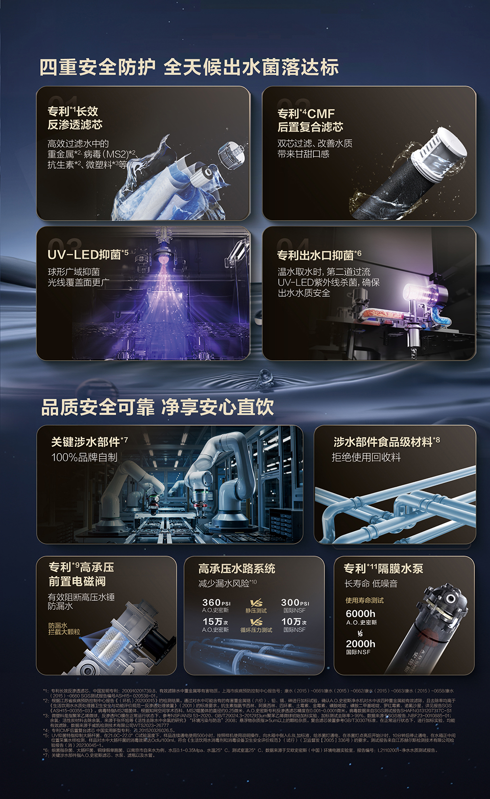 专利长效反渗透滤芯,高效过滤水中的重金属、病毒(MS2)、抗生素、微塑料等;