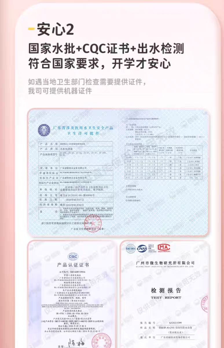 安心二:国家水批,CQC证书,出水检测,符合国家要求,开学才安心