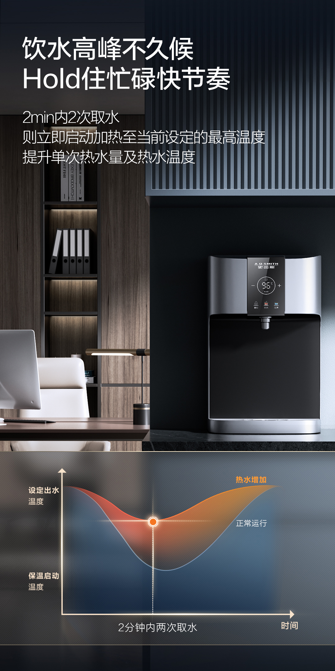 热水智能增容,保障高峰用水:2min内连续2次取水,即启动补水并加热至设定温度;