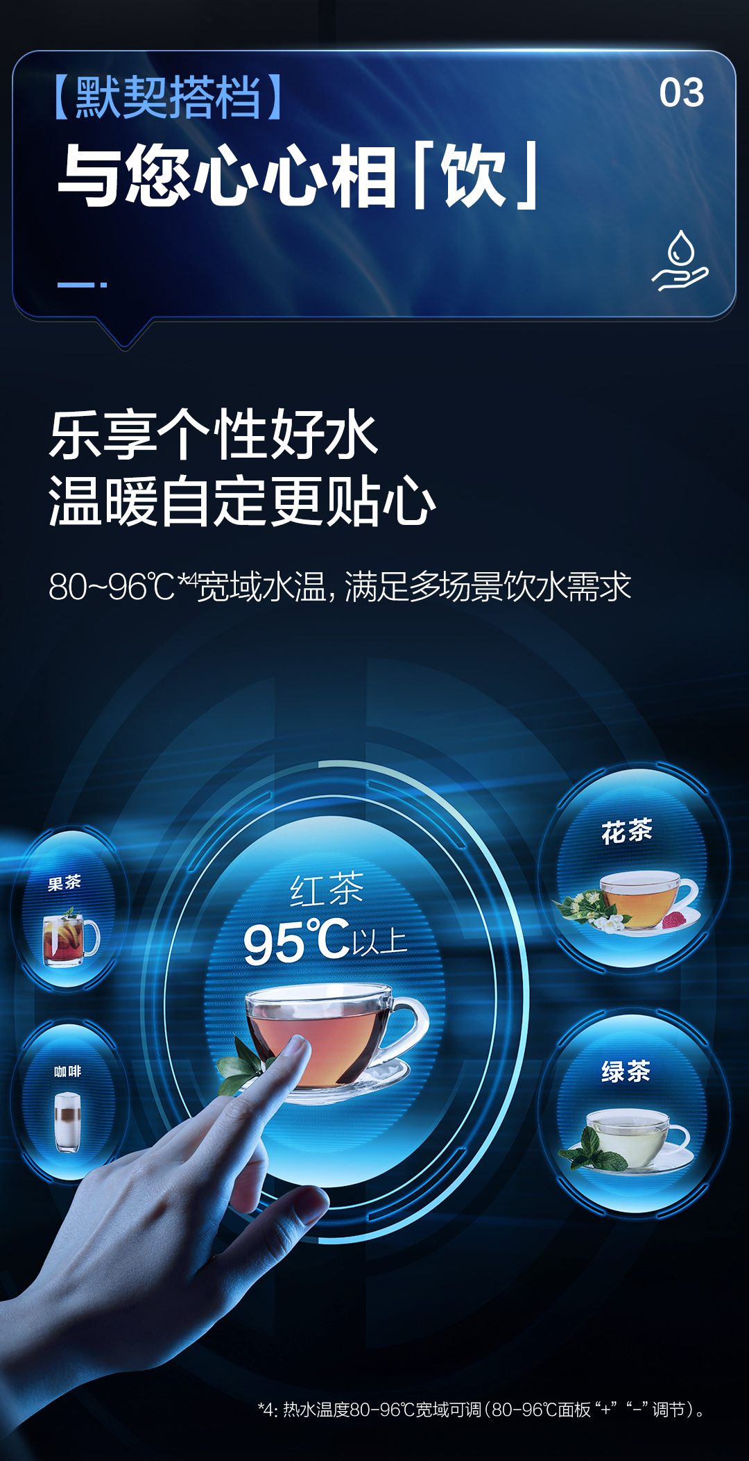 热水温度80-96℃宽域可调(面板“+”“-”调节),满足日常各种饮品冲泡需求;